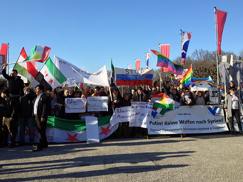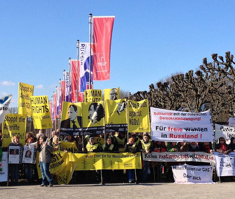 У входа в здание ярмарки провли митинг правозащитники. Активисты Amnesty International требовали прекратить атаки на НКО, сирийская община - прекратить поставки российского оружия в Сирию.