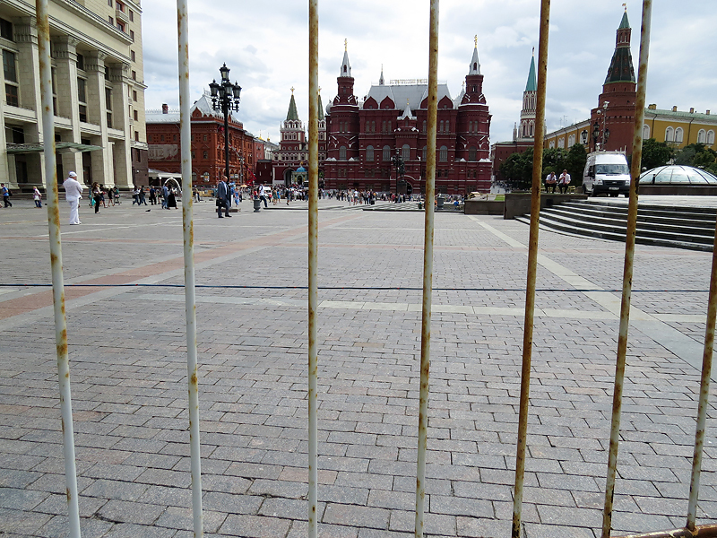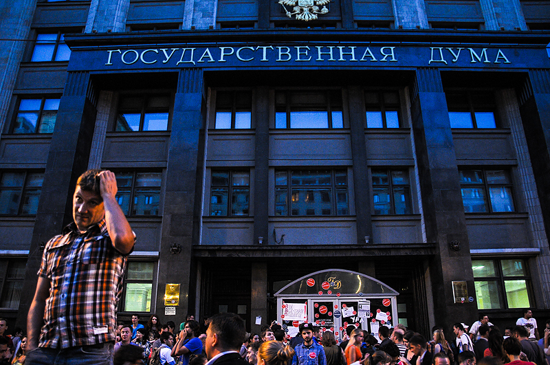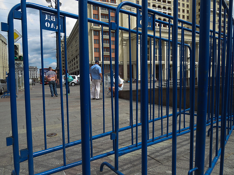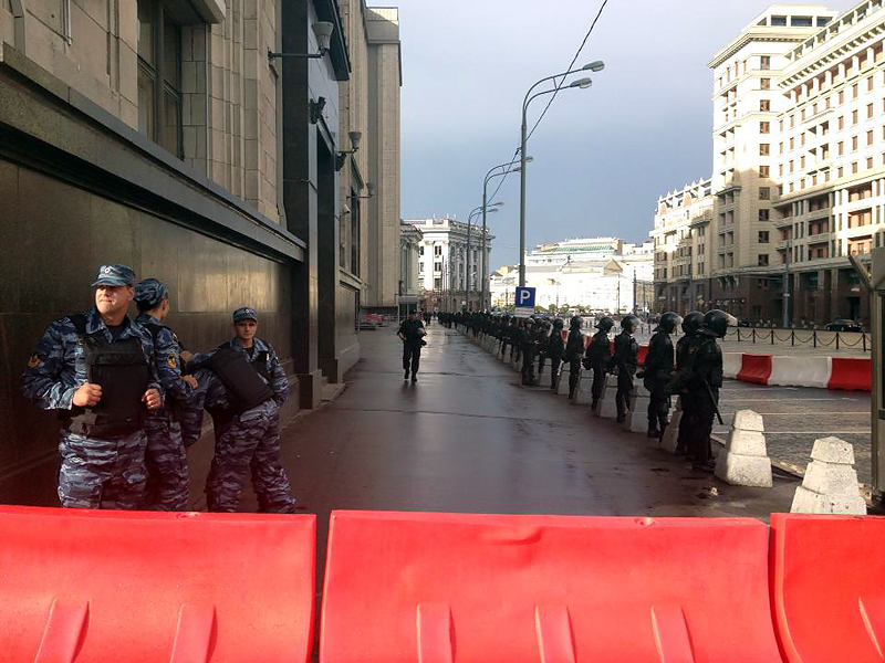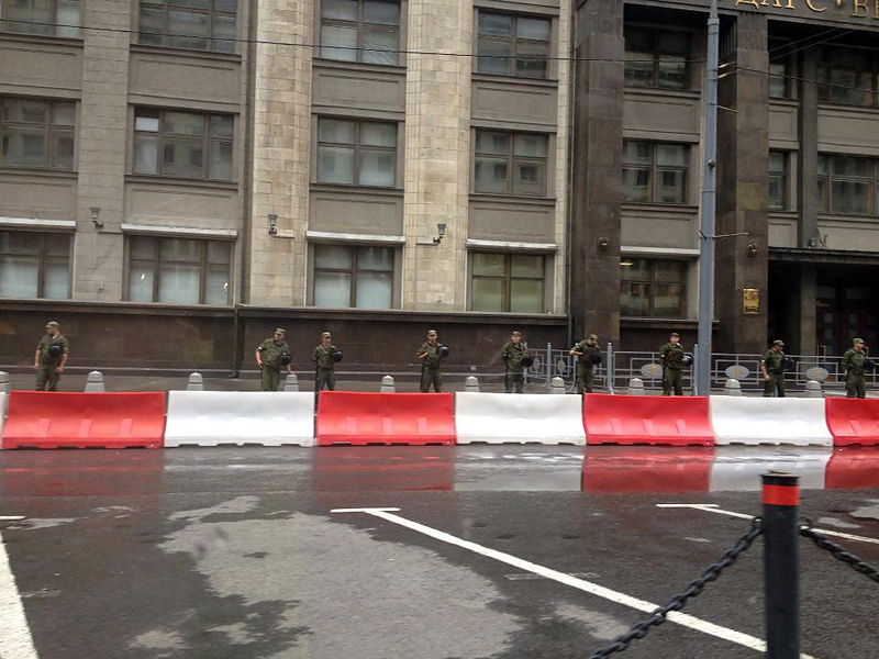 Полина Химшиашвили / ВедомостиВдоль фасада здания Госдумы, от угла Моховой и Тверской улиц до угла Моховой и Большой Дмитровки выставлено оцепление и установлены заградительные тумбы, обычно используемые для ограждения территории дорожных работ, передает корреспондент «Ведомостей»