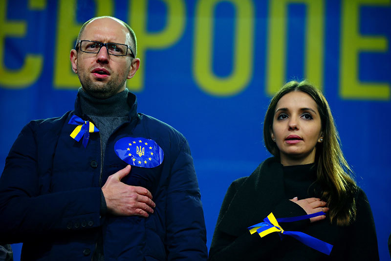 Лидер фракции "Батькивщина" в Раде Арсений Яценюк и дочь Юлии Тимошенко Евгения во время акции "За европейскую Украину" на Майдане Независимости с требованием возобновить переговоры об ассоциации Украины с Евросоюзом