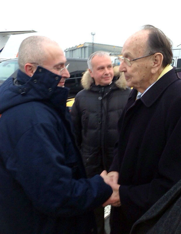Пресс-центр Михаила Ходорковского и Платона Лебедева / khodorkovsky.ruБывший глава компании "ЮКОС" Михаил Ходорковский и бывший министр иностранных дел ФРГ Ганс-Дитрих Геншер (слева направо на первом плане) во время встречи в аэропорту города. Фото ИТАР-ТАСС