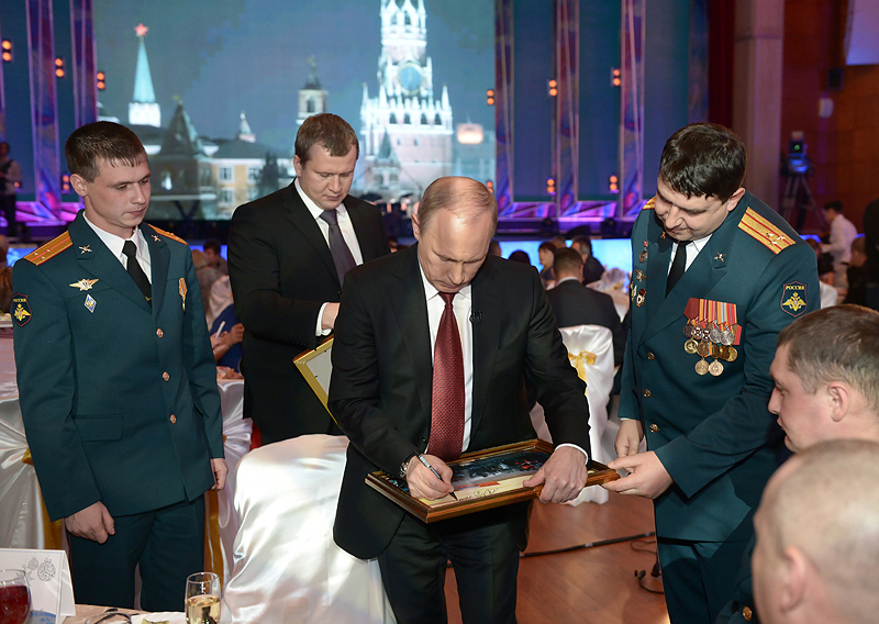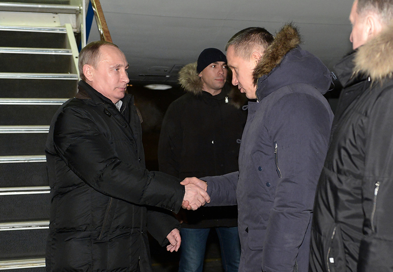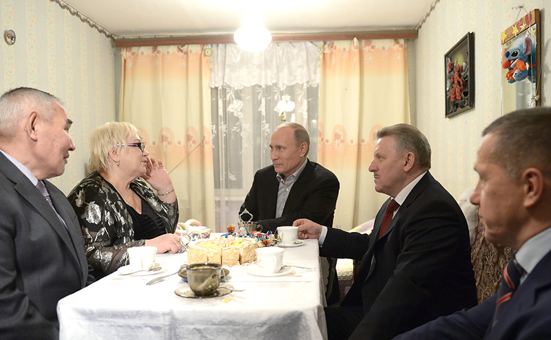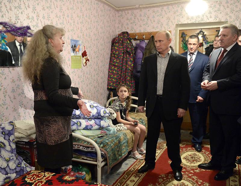 Алексей Никольский / РИА НовостиПрезидент России Владимир Путин, полномочный представитель президента в Дальневосточном ФО Юрий Трутнев и губернатор Хабаровского края Вячеслав Шпорт во время посещения одного из пунктов временного размещения пострадавших от наводнения в Хабаровске