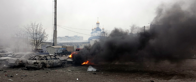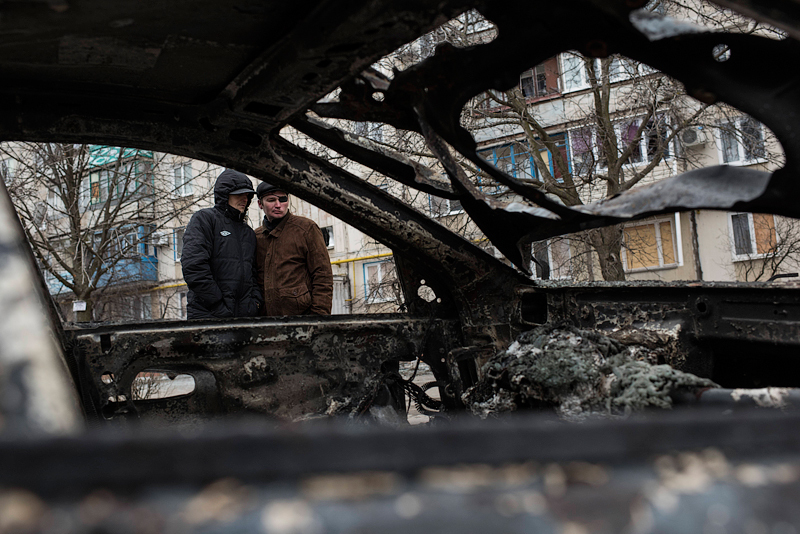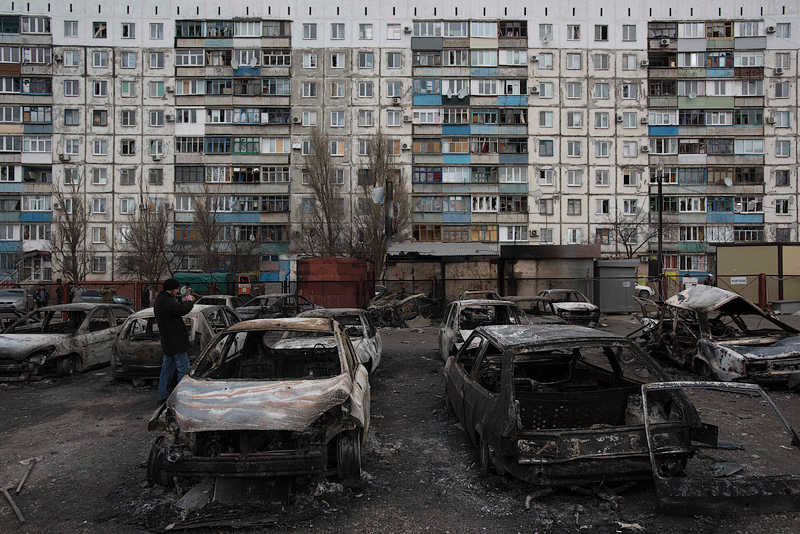 Искореженные автомобили на одной из улиц Мариуполя после обстрела города