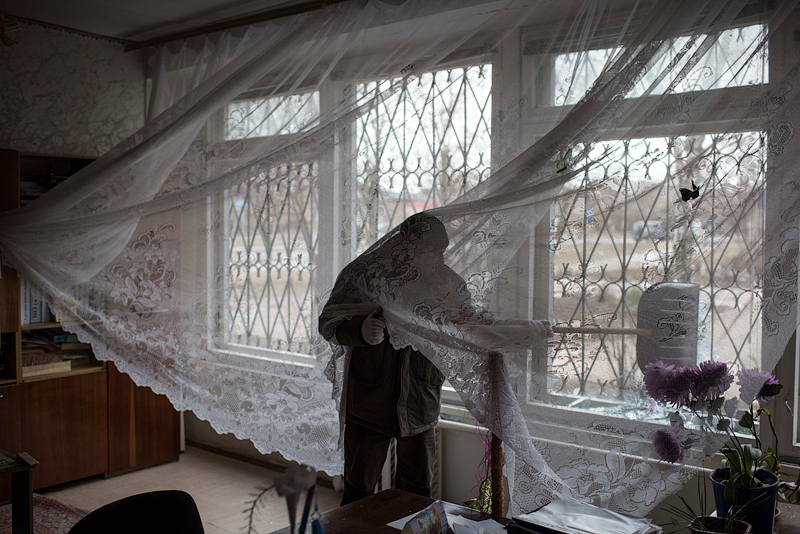 Жители Мариуполя закрывают полиэтиленовой пленкой окна с выбитыми в результате обстрела стеклами