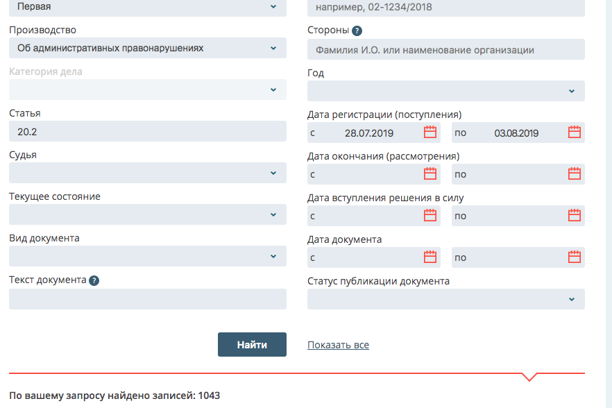 Московские суды за неделю с 28 июля по 3 августа рассмотрели 1043 административных дела по ст. 20.2 КоАП (нарушение установленного порядка организации либо проведения собрания, митинга, демонстрации, шествия или пикетирования). Об этом свидетельствуют данные на официальном портале судов общей юрисдикции Москвы. Первым на это обратил внимание Telegram-канал «Апология протеста».