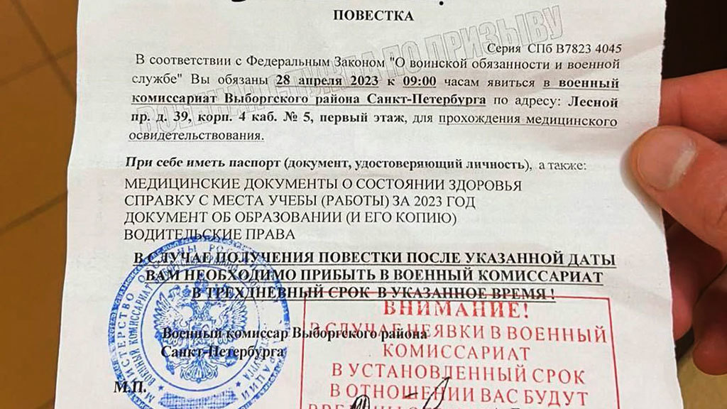 Военные подтвердили рассылку в Петербурге повесток с напоминанием о последствиях неявки