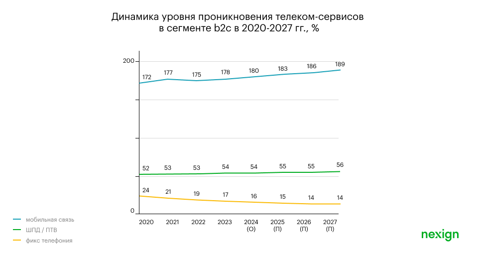 В сегменте b2c показатель ARPU традиционно самый высокий в мобильной связи: он составил 391 руб./мес. в 2024 году с прогнозом роста до 438 руб./мес. к 2027 году. В свою очередь, ARPU для телефонии и платного ТВ упадет с 245 до 230 руб./мес. и с 245 до 241 руб./мес. за тот же период времени, соответственно. Это объясняется снижением интереса к этим услугам и уменьшением абонентской базы. Для широкополосного доступа (ШПД) ARPU вырастет с 378 до 383 руб./мес. в сегменте b2c и с 2,75 до 2,77 тыс. руб./мес. в сегменте b2b/b2g. Здесь тенденция к медленному росту связана с насыщением рынка в крупных и средних городах и сохраняющейся популярностью беспроводного интернета. Значительный рост показателя выручки на одного клиента в отдельных телеком-направлениях не возможен из-за высокого уровня их проникновения и конкуренции в сегментах b2b и b2c. Поэтому операторы продолжают делать ставку на комплексные, конвергентные предложения, которые включают сразу несколько типов связи, дополнительные цифровые продукты и услуги — свои или партнерские.