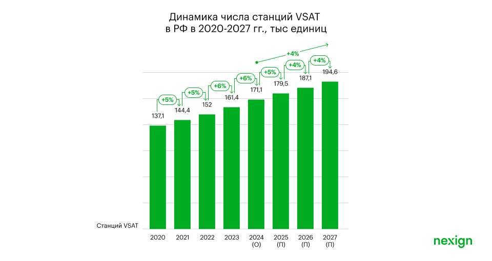 Индустрия фиксированной спутниковой связи (VSAT) демонстрирует стабильный рост: в 2024 году выручка увеличилась на 8% и составила 7,97 млрд руб., а в 2025-2027 годах будет расти в среднем на 6% ежегодно. Также происходит расширение отрасли за счет стабильного увеличения количества базовых станций: в 2024 году насчитывалось около 171 тысячи станций VSAT, а к 2027 году их численность вырастет до 194 тысяч.