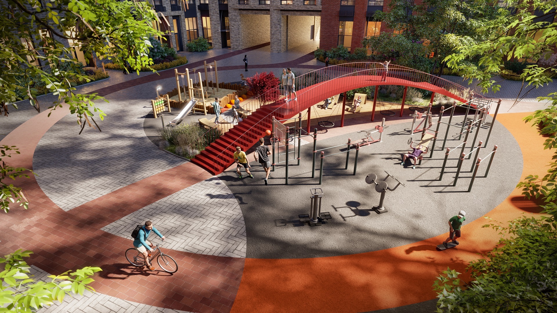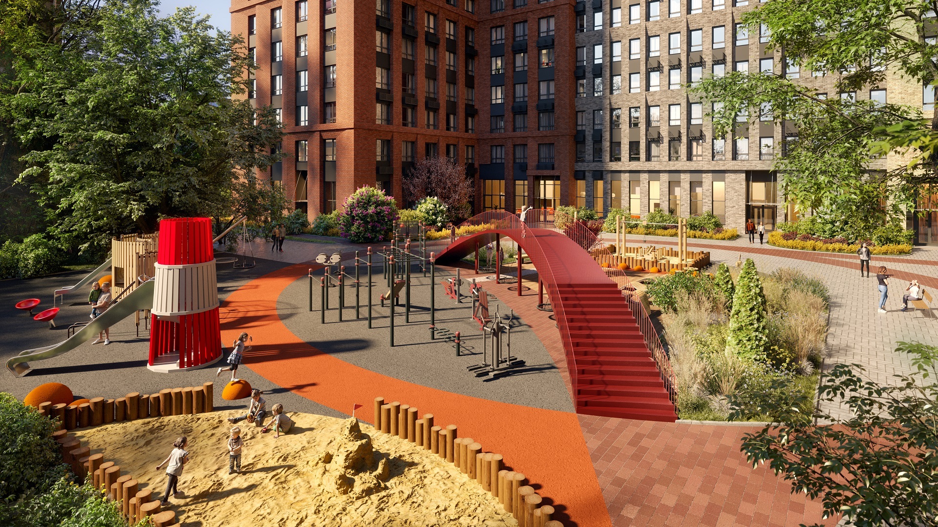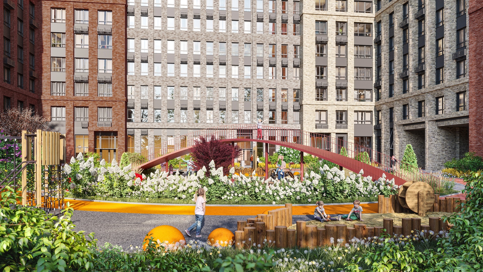 Для детей всех возрастов предусмотрены площадки с разнообразными игровыми элементами. Также во дворе проекта можно будет сыграть в настольный теннис и кикер, отдохнуть в гамаке или заняться спортом. А амфитеатр станет местом для творческого взаимодействия соседей и проведения праздников.