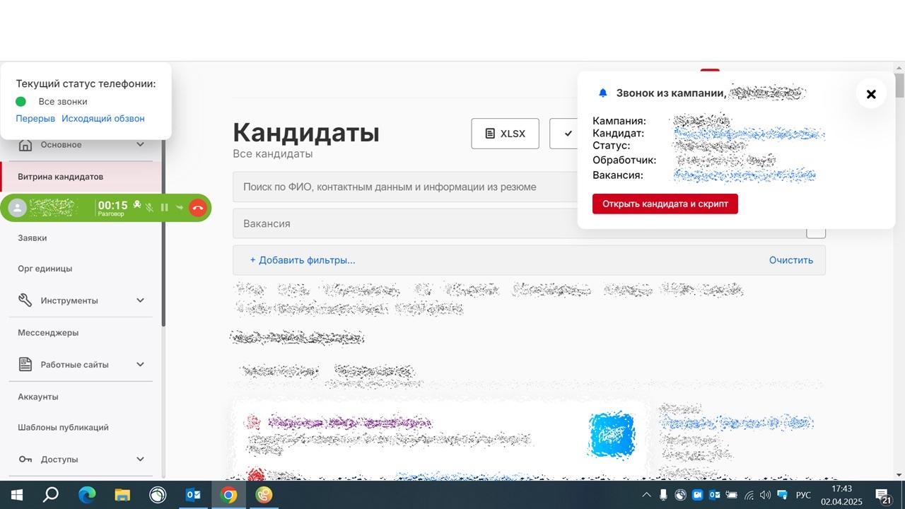 Когда соискатель отвечает на звонок – система соединяет его с ресечером и выводит карточку кандидата на экран сотрудника. Прямо в интерфейсе HR-платформы Skillaz.