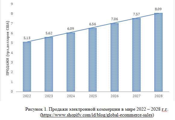 Активный тренд на рост наблюдается с 2022 года примерно на 0,5 трлн. долларов США и по прогнозам, в 2025 году мировые продажи в сфере электронной коммерции достигнут 6,56 трлн. долларов США, а к 2028 году приблизятся к 8,1 трлн. долларов США.