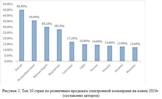 Международные торговые операции через электронную коммерцию ведутся преимущественно через такие страны как: Китай, Великобритания, Южная Корея и Индонезия. В ходе исследований отечественных и зарубежных компаний и созданных ими цепей поставок выявлено, что динамика развития электронной коммерции напрямую зависит от уровня международного взаимодействия. Наиболее заметный рост наблюдается в регионах с развитой инфраструктурой и поддержкой цифровых инициатив, таких как Китай, США, Россия.