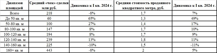 Однако за этими впечатляющими цифрами кроется сложная картина, отражающая меняющуюся структуру спроса и формирующая обновленный портрет покупателя. Средний чек сделки по рынку в целом немного снизился, составив порядка 218 млн рублей, в то время как средняя цена проданного квадратного метра, напротив, выросла примерно на 6,6% до 1,7 млн рублей. Этот, казалось бы, противоречивый тренд объясняется изменениями в предпочтениях покупателей относительно площади помещений и динамикой цен внутри каждого сегмента.