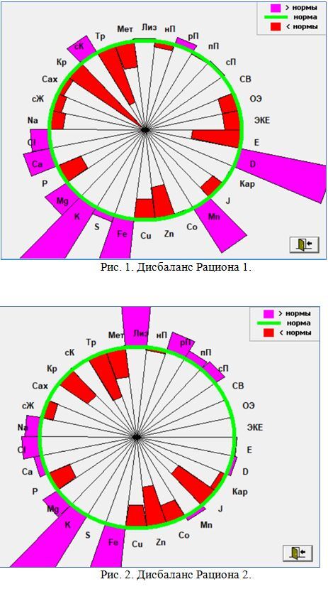 На рис. 1 и 2 показаны диаграммы сбалансированности двух рационов, где окружность – это нормы, которым должна соответствовать питательность рациона, недокорм показан цветом внутри окружности, перекорм – сектором, выходящим из окружности.