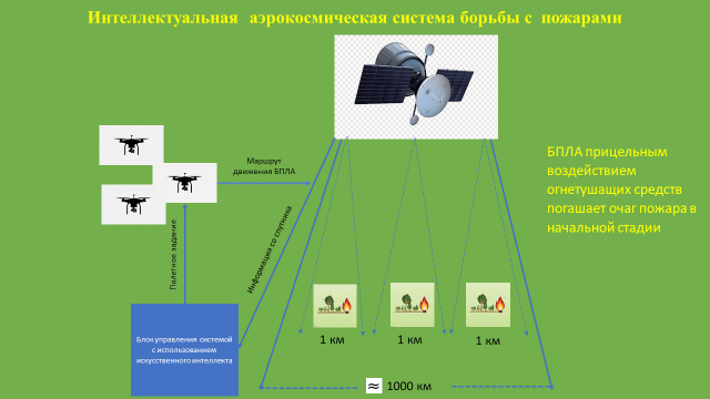 Предлагаемая интеллектуальная аэрокосмическая система борьбы с лесными и ландшафтными пожарами основана на идее совместного применения данных спутникового мониторинга и данных с БПЛА, используя преимущества каждого из этих видов мониторинга. На первом этапе с помощью спутникового мониторинга определятся область для детального контроля. На втором этапе в данную область направляются БПЛА, для более подробной оценки местности, что позволит с большой точностью определить проблемные участки, уменьшить частоту ошибок и ложных срабатываний системы мониторинга, а также для тушения пожаров. В случае применения только БПЛА, для выявления проблемных областей может потребоваться большое количество времени и технических средств, что существенно снизит эффективность от их использования.