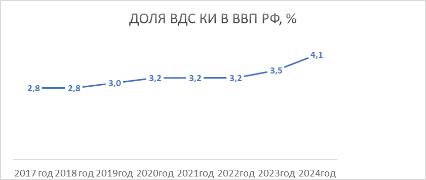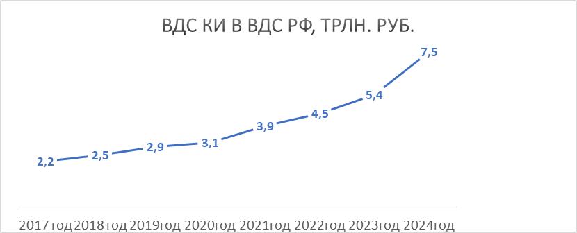 Исследование показало, что за анализируемый период с 2017 по 2024 год валовая добавленная стоимость креативных индустрий в ВВР РФ выросла в 2,3 раза, с 2,2 трлн. руб. до 7,5 трлн. руб. соответственно. Доля валовой добавленной стоимости креативных индустрий в ВВП РФ за анализируемый период увеличилась практически на 50%.