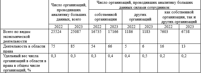 Анализ данных показывает, что, несмотря на общее снижение числа организаций, проводивших аналитику больших данных, в юридической сфере наблюдается положительная динамика. Юридические организации все чаще развивают внутренние компетенции и используют внешние ресурсы для аналитики больших данных. Это свидетельствует о растущем понимании важности данных в юридической практике и инвестициях в соответствующие технологии и обучение персонала.