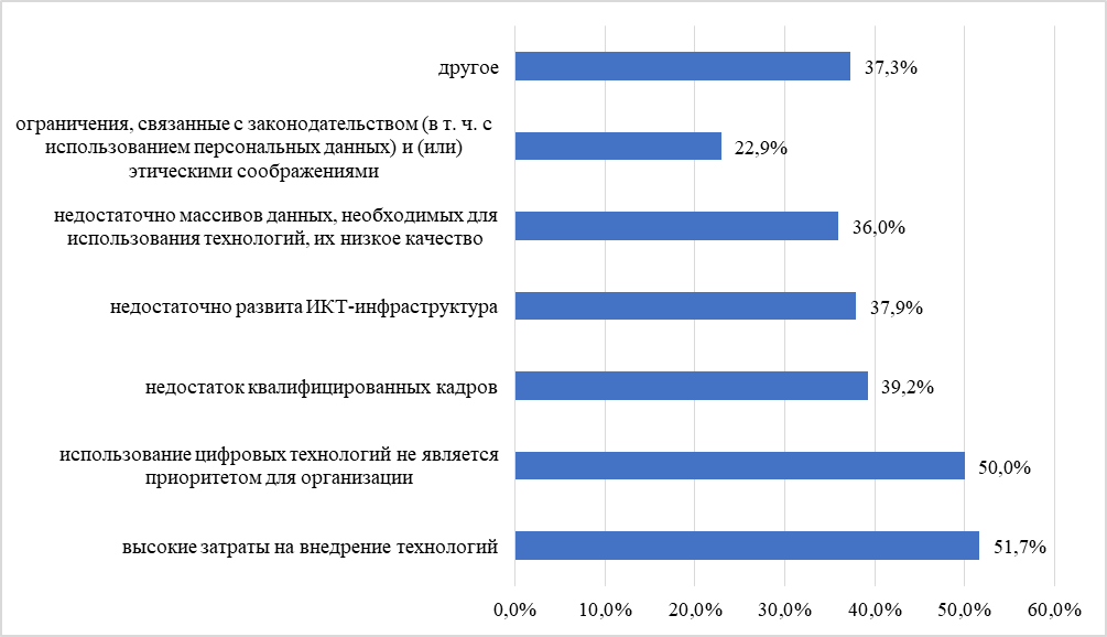 На основе анализа результатов опроса организаций, согласно данным Росстат 2023 года, выделены ключевые препятствия, сдерживающие применение аналитики больших данных, в том числе в правовой сфере.