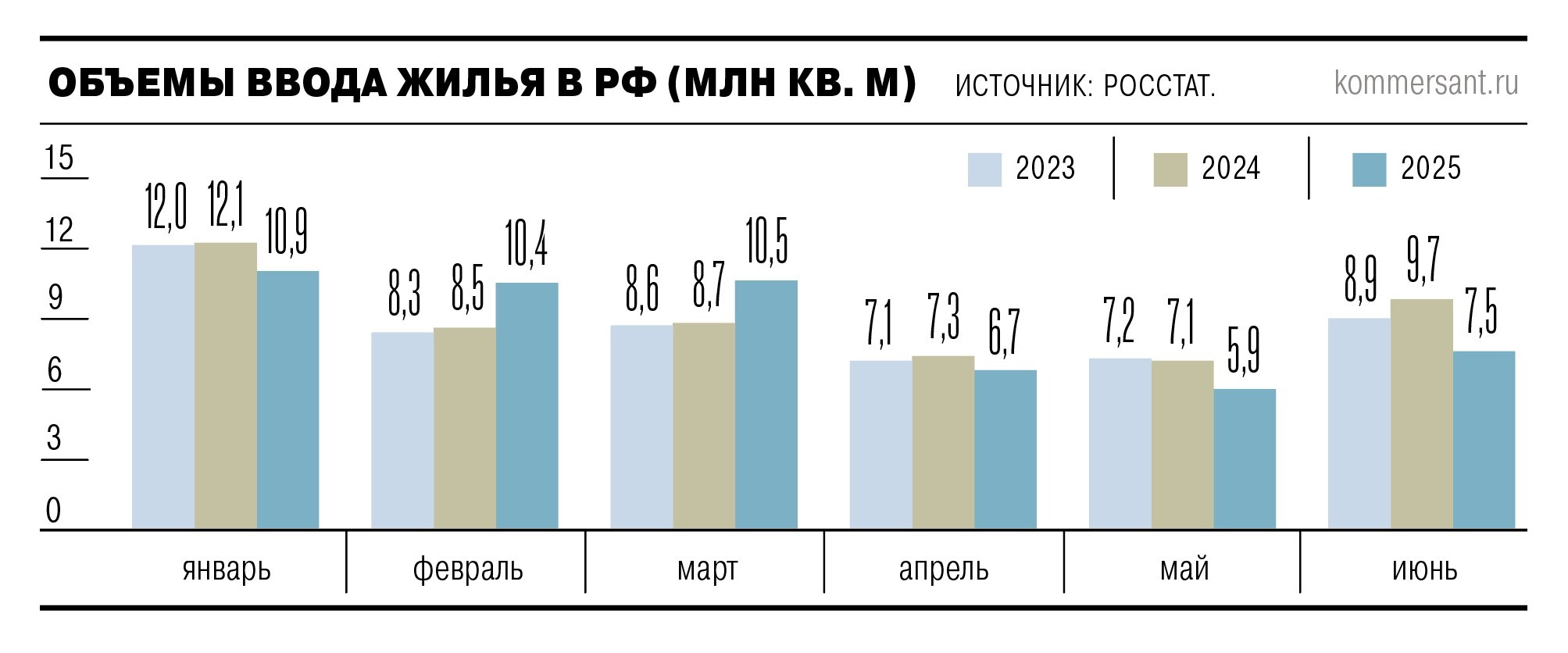 На 2,4% в годовом выражении (до 52,2 млн кв. м) снизился ввод жилья в первом полугодии 2025 года, пишет «Коммерсантъ» со ссылкой на Росстат. Такая динамика вызвана провалом темпов ввода объектов индивидуального жилищного строительства (ИЖС) — именно на этот сегмент приходится бóльшая часть объемов ввода жилья в стране. А в секторе многоквартирного жилья (МКД) напротив наблюдается рост на 23%. Президент Национального объединения строителей (НОСТРОЙ) Антон Глушков полагает, что это июньский всплеск, связанный с завершением строительства отдельных крупных объектов.