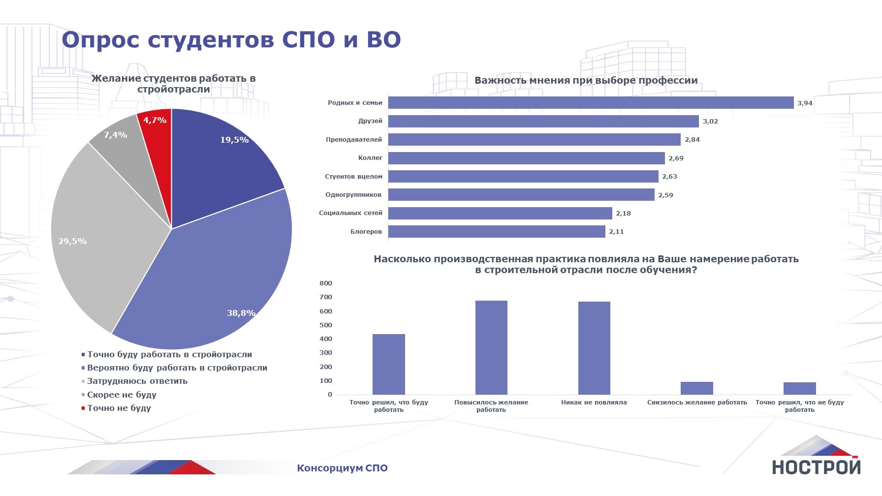 Отраслевой Консорциум среднего профессионального образования в сфере строительства (Консорциум СПО), действующий на базе Национального объединения строителей (НОСТРОЙ), подвел итоги масштабного исследования «Привлечение специалистов в строительный сектор». Ключевой вывод: почти 60% выпускников твердо намерены или вероятно будут работать в строительной отрасли. Об этом 17 июля 2025 года на полях выставки OpenVillage'25 заявила директор по развитию – руководитель проектного офиса НОСТРОЙ Елена Парикова.