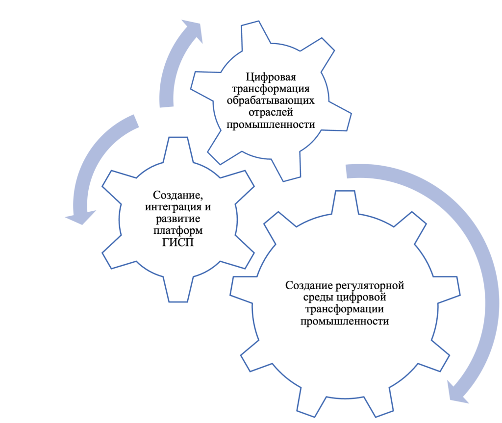 Реализация первого направления предполагает развитие законодательной и нормативно-технической баз в сфере цифровых технологий, информационных мер государственной поддержки, создание программ переподготовки и повышения квалификации для каждой отрасли обрабатывающей промышленности.