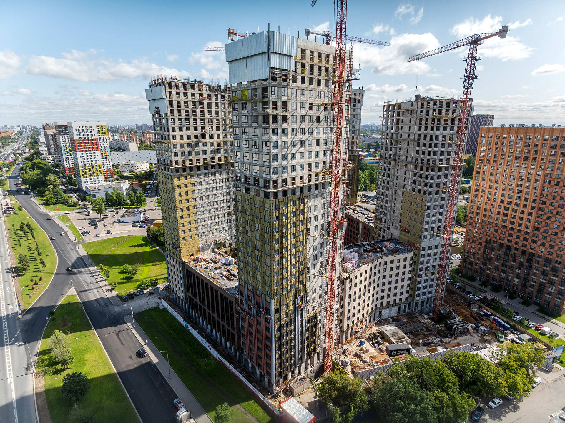Активно продолжается возведение внутренних и наружных стен — выполнено около 80% от объёма наземной части. Монтаж светопрозрачных конструкций также приближается к финишу: установлено более 70% оконных блоков в жилых помещениях.