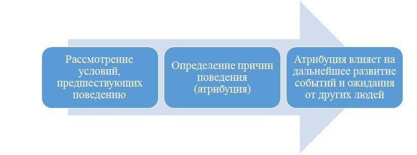 Теория атрибуции связана с тем, как люди интерпретируют события (в случае рекламы – триггеры), и как эти события связаны с их мышлением и поведением. Трехэтапный процесс атрибуции представлен на рисунке и позволяет выявить не только причины того и или иного поведения людей, но и прогнозировать дальнейшее развитие событий, а также ожидания людей.