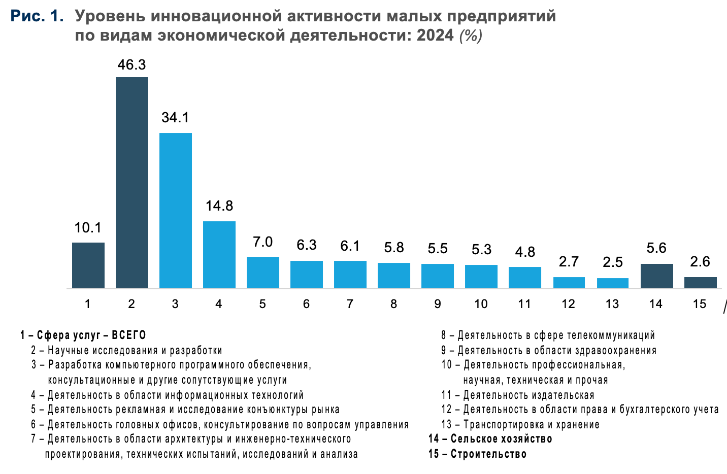 В 2024 г. самым инновационным сегментом малого бизнеса стала сфера услуг. Разработку и внедрение инноваций осуществляли 10,1% малых предприятий. Инновационная активность компаний в области сельского хозяйства и строительства значительно ниже — 5,6 и 2,6% соответственно.