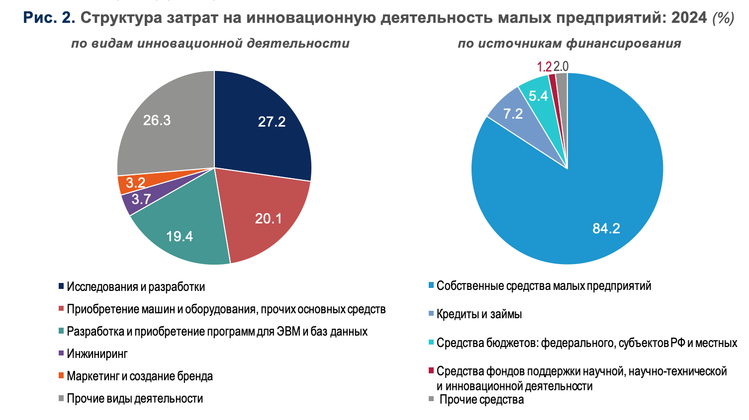 Основным источником финансирования инновационной деятельности малых предприятий являются их собственные средства (84,2%).