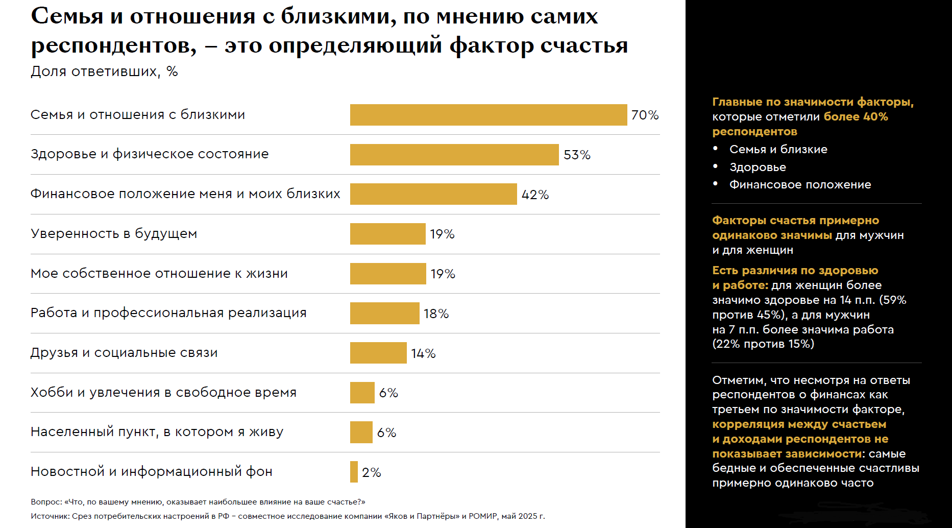 Наиболее значимыми источниками счастья респонденты назвали семью и отношения с близкими (около 70% опрошенных), здоровье (53% респондентов) и финансовое положение (42% участников опроса). Причем существенную роль также играет тип семейных отношений: уровень счастья среди тех, кто официально состоит в браке, оказался выше на 9 процентных пунктов, чем среди тех, кто живет в гражданском союзе.