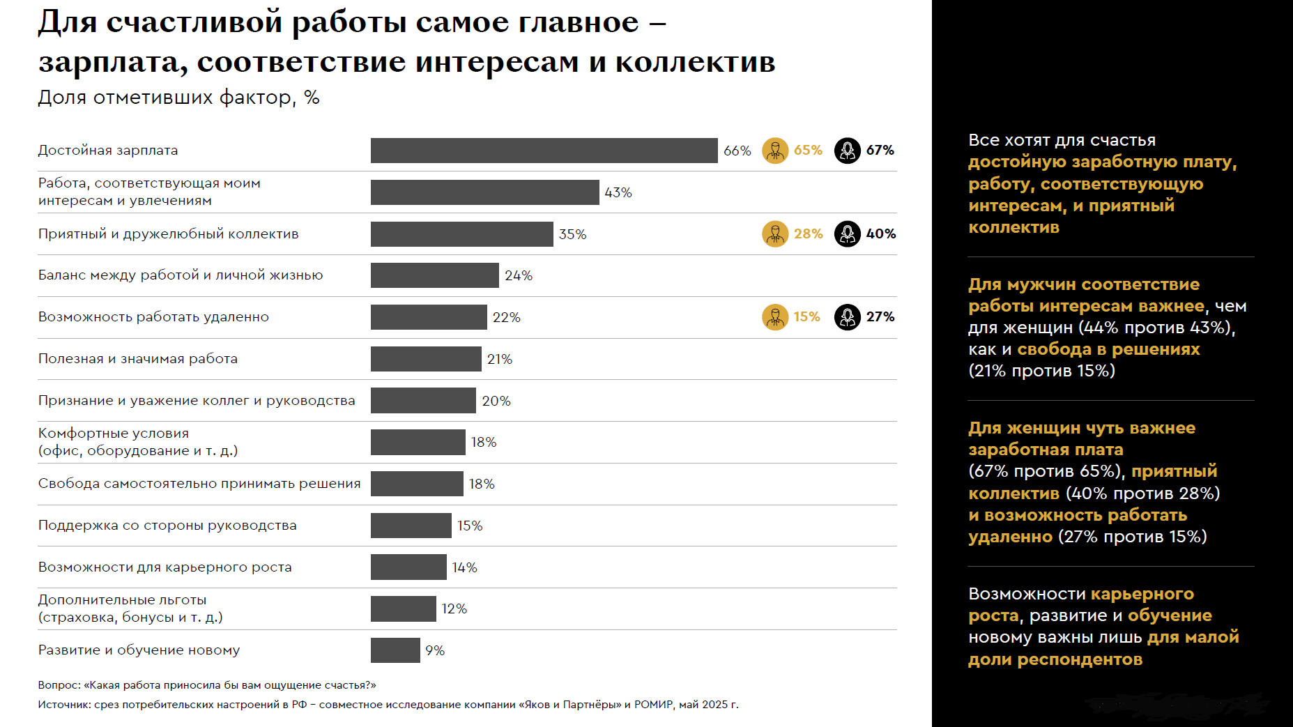 Главными характеристиками «счастливой работы» респонденты назвали достойную зарплату (указали 67% женщин и 65% мужчин), соответствие интересам (44% мужчин и 43% женщин) и приятный коллектив (40% женщин и 28% мужчин).