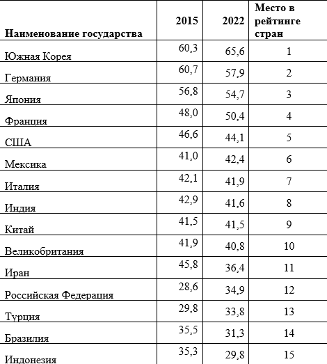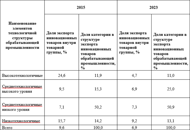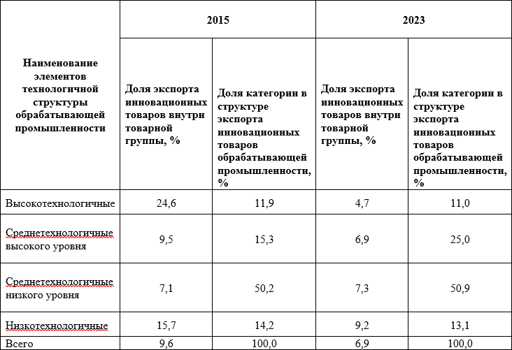 На основе данных таблицы 2 доцент Трифонов П.В. отмечает, что доля высокотехнологичных и среднетехнологичных высокого уровня отечественных товаров в структуре экспорта инновационных товаров за последние 8 лет не изменилась и колеблется в диапазоне от 27 до 36 % в сравнении со значениями аналогичного показателя в Иране (50%) и Турции (40%), что свидетельствует о сырьевом статусе выпускаемой в РФ продукции обрабатывающей промышленности. Сырьевые отрасли входят в состав секторов среднетехнологичного низкого уровня и низкотехнологичного, доля которых составляет более 60% и не меняется за последние годы.