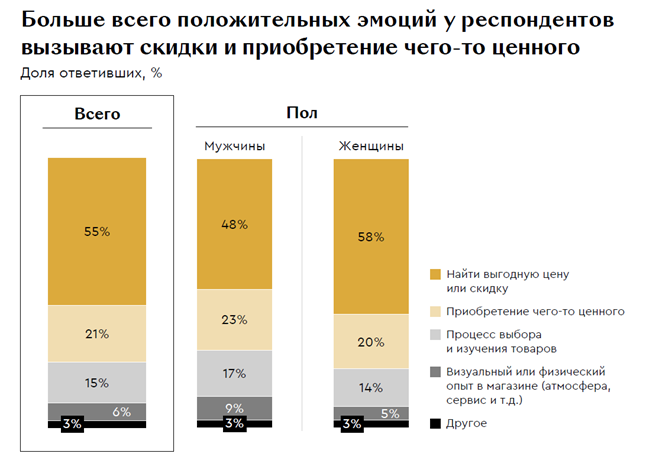 Главным источником положительных эмоций при совершении покупок для респондентов оказались скидки — этот фактор назвали решающим 55% опрошенных. Причем удовольствие от скидок чаще испытывают женщины (58%), чем мужчины (48%). При этом сами мужчины в два раза больше женщин ценят визуальный и физический опыт от процесса покупки (9% против 5%), свидетельствуют результаты исследования.