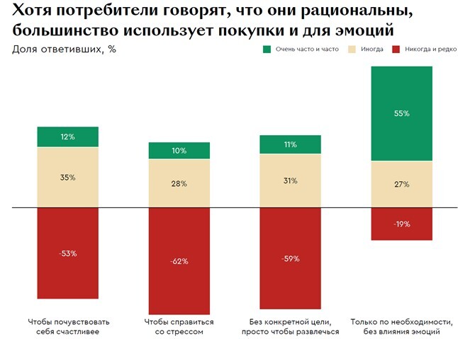 Хотя бы одну эмоциональную причину для шопинга выбрали 67% женщин и 55% мужчин. Так, 47% россиян признаются, что ходят за покупками, чтобы почувствовать себя счастливее, 42% — чтобы развлечься, и 38% — чтобы справиться со стрессом.