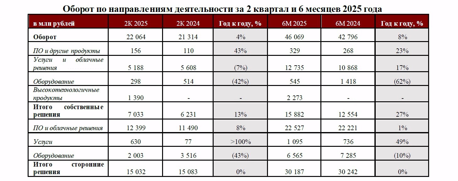 Оборот Компании достиг 46,1 млрд рублей, увеличившись на 8% по сравнению с показателем, зафиксированным по итогам 6 месяцев 2024 года. В структуре оборота 34% показателя пришлась на оборот от продажи собственных решений Группы, что составляет 15,9 млрд рублей (+27% г/г);