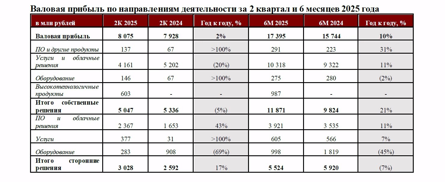 Валовая прибыль от продажи собственных услуг и облачных решений Группы во 2 квартале снизилась на 20% г/г в основном из-за индексации на привлечение субподрядчиков, связанной с общим трендом на повышением заработных плат, однако в целом по итогам 6 месяцев 2025 года валовая прибыль от продажи собственных услуг и облачных решений, напротив, выросла на 11% г/г, до 10,3 млрд рублей.