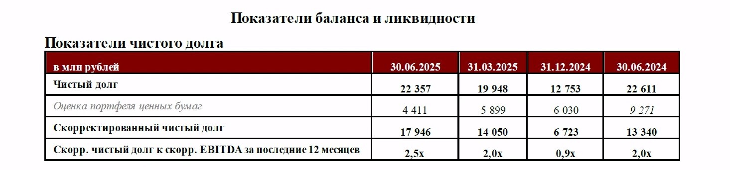 При этом, повышение скорректированного чистого долга по сравнению с предыдущей отчетной датой (на 31.03.2025) связано с традиционной сезональностью бизнеса. Динамика долговой нагрузки год к году остается стабильной, в рамках финансовой стратегии Холдинга.