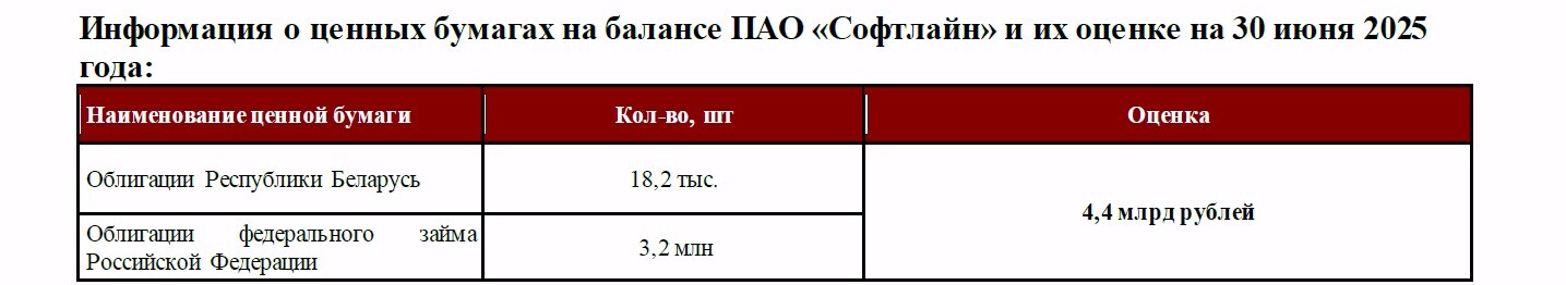 В марте 2025 года ПАО «Софтлайн» объявило о замещении еврооблигаций Республики Беларусь из своего портфеля на обращающиеся на Московской бирже ценные бумаги на сумму 6,0 млрд рублей по номиналу. Компания может беспрепятственно осуществлять операции с принадлежащими ей замещенными облигациями Республики Беларусь в соответствии с действующим законодательством и правилами торгов. После отчетной даты Группа продала все принадлежащие ей облигации Республики Беларусь, получив существенную прибыль от данной инвестиции. Часть свободных денежных средств Компания использует для покупки высоколиквидных облигаций федерального займа Российской Федерации для получения дополнительного дохода.