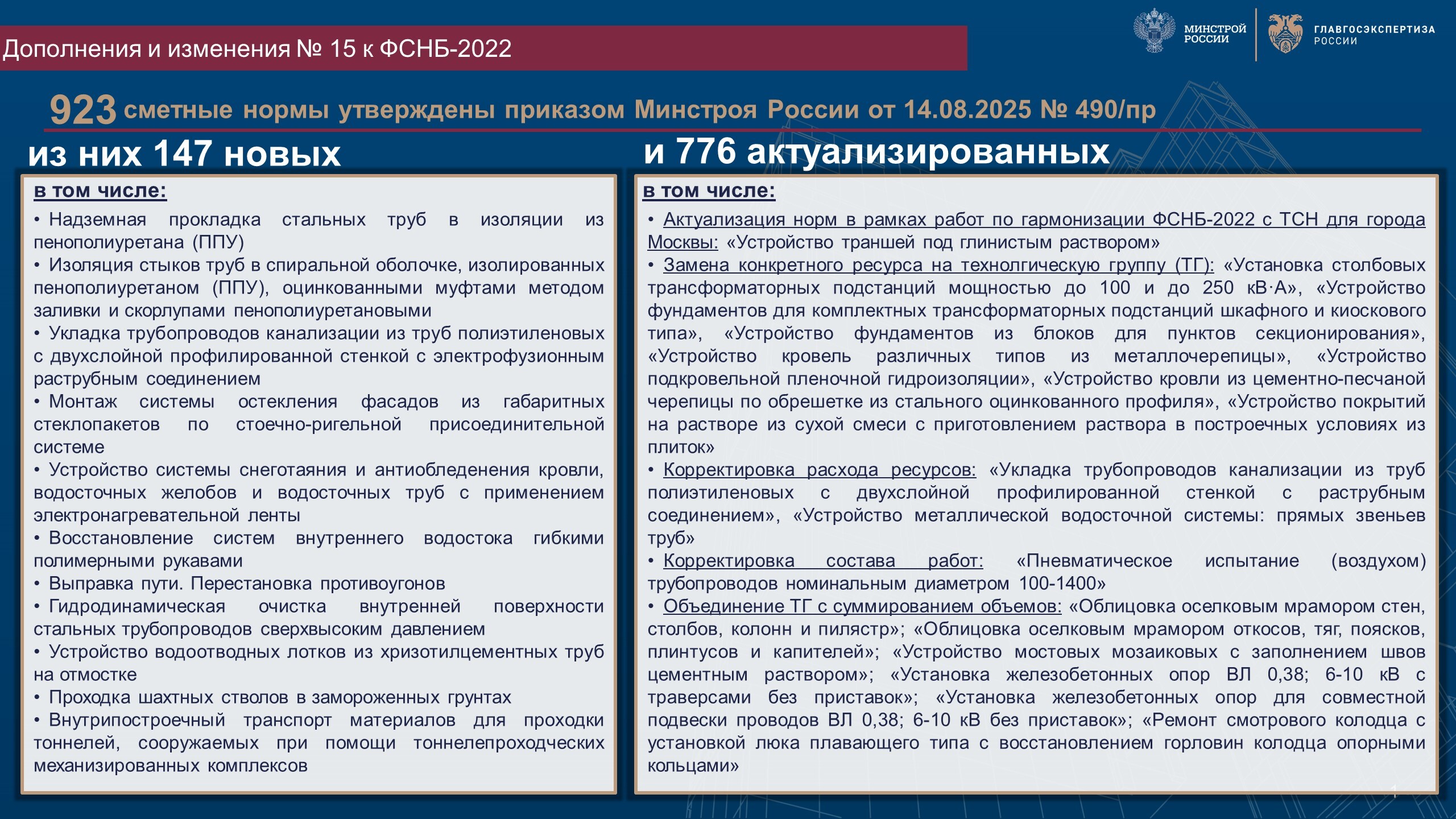 Приказом Минстроя России от 14.08.2025 № 490/пр утверждены дополнения и изменения № 15 к ФСНБ-2022, в состав которых включены в том числе:
