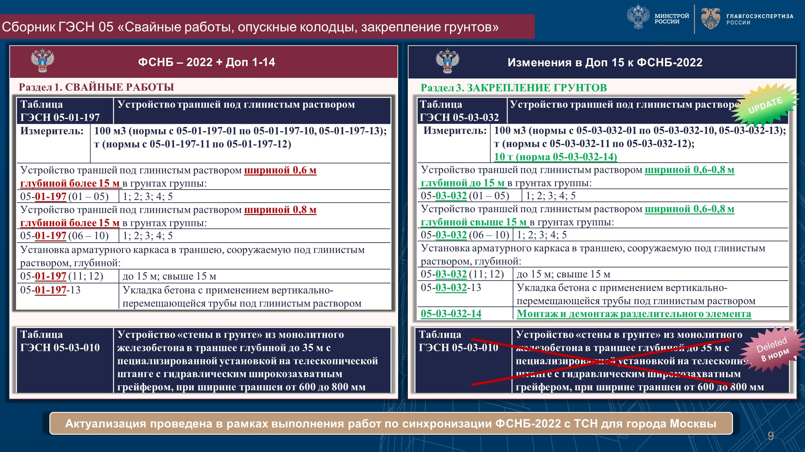 При этом сметные нормы таблицы ГЭСН 05-03-010 «Устройство "стены в грунте" из монолитного железобетона в траншее глубиной до 35 м специализированной установкой на телескопической штанге с гидравлическим широкозахватным грейфером, при ширине траншеи от 600 до 800 мм» исключены.