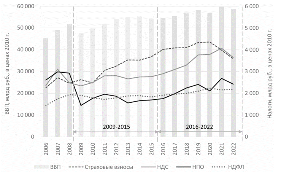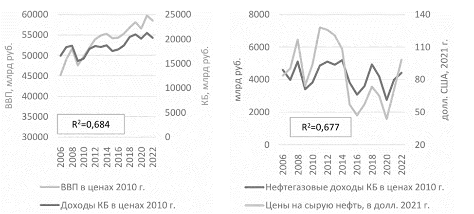 Анализируемый период охватывает данные с 2006 г. по 2022 г. включительно с разбивкой на нефтегазовые и ненефтегазовые доходы. Основное внимание уделено периоду развития российской экономики, начиная с ее сильного падения в 2009 г. вследствие Великой рецессии (2007–2009 гг.), после которого началось экономическое восстановление. Но дело не только в этом. Главное: что мировой финансово-экономический кризис продемонстрировал