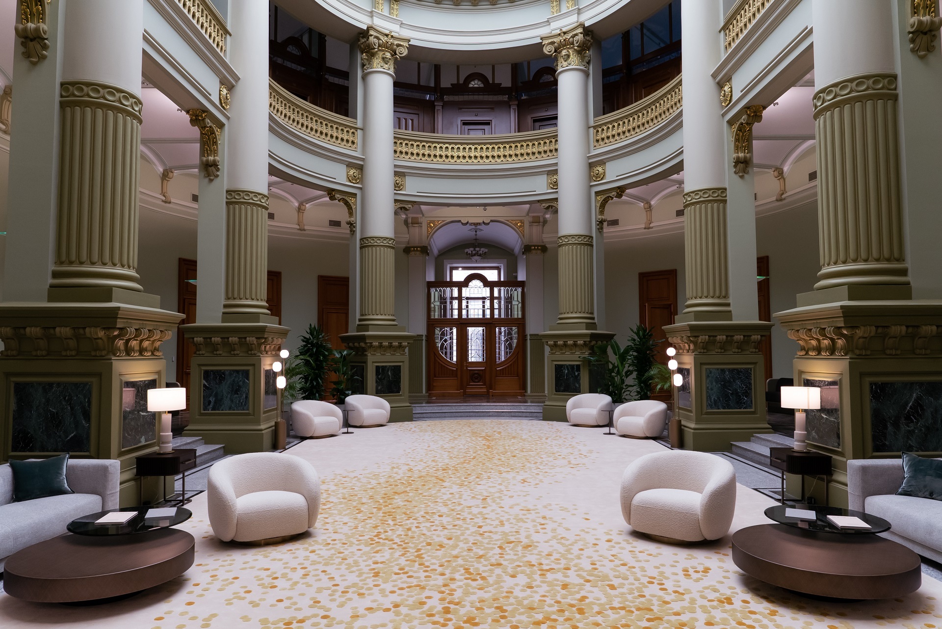 В гостиной офиса продаж посетители могут полюбоваться стеклянным куполом – крышей-«фонарем», разработанным инженером Владимиром Шуховым, автором знаменитой Шуховской башни. Здесь также можно видеть реплику утраченных ранее уникальных часов с двусторонним циферблатом, а также уникальный для конца XIX века лифт, оформленный коваными решётками с растительным орнаментом.