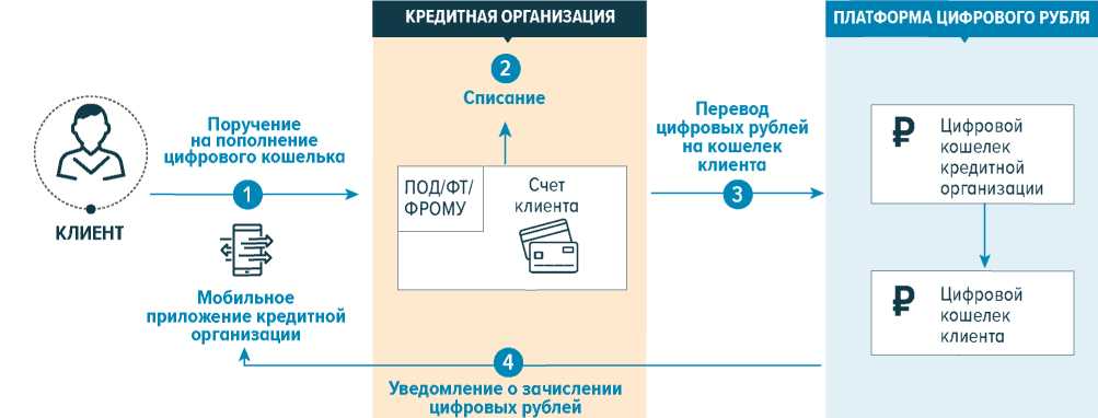Сначала обсудим процедуру использования цифровых рублей населением страны. Модель цифрового рубля такова, что банкам (участникам платформы цифрового рубля) будут открываться кошельки на платформе цифрового рубля оператором платформы (Банком России), а затем банки будут открывать кошельки в цифровых рублях всем заинтересованным пользователям – физическим и юридическим лицам. Для пополнения цифрового кошелька пользователю необходимо через мобильное приложение банка, в котором он обслуживается, направить поручение на обмен безналичных средств (средств на счете в банке) на цифровые рубли, которые будут зачислены в его кошелек (рисунок 1)