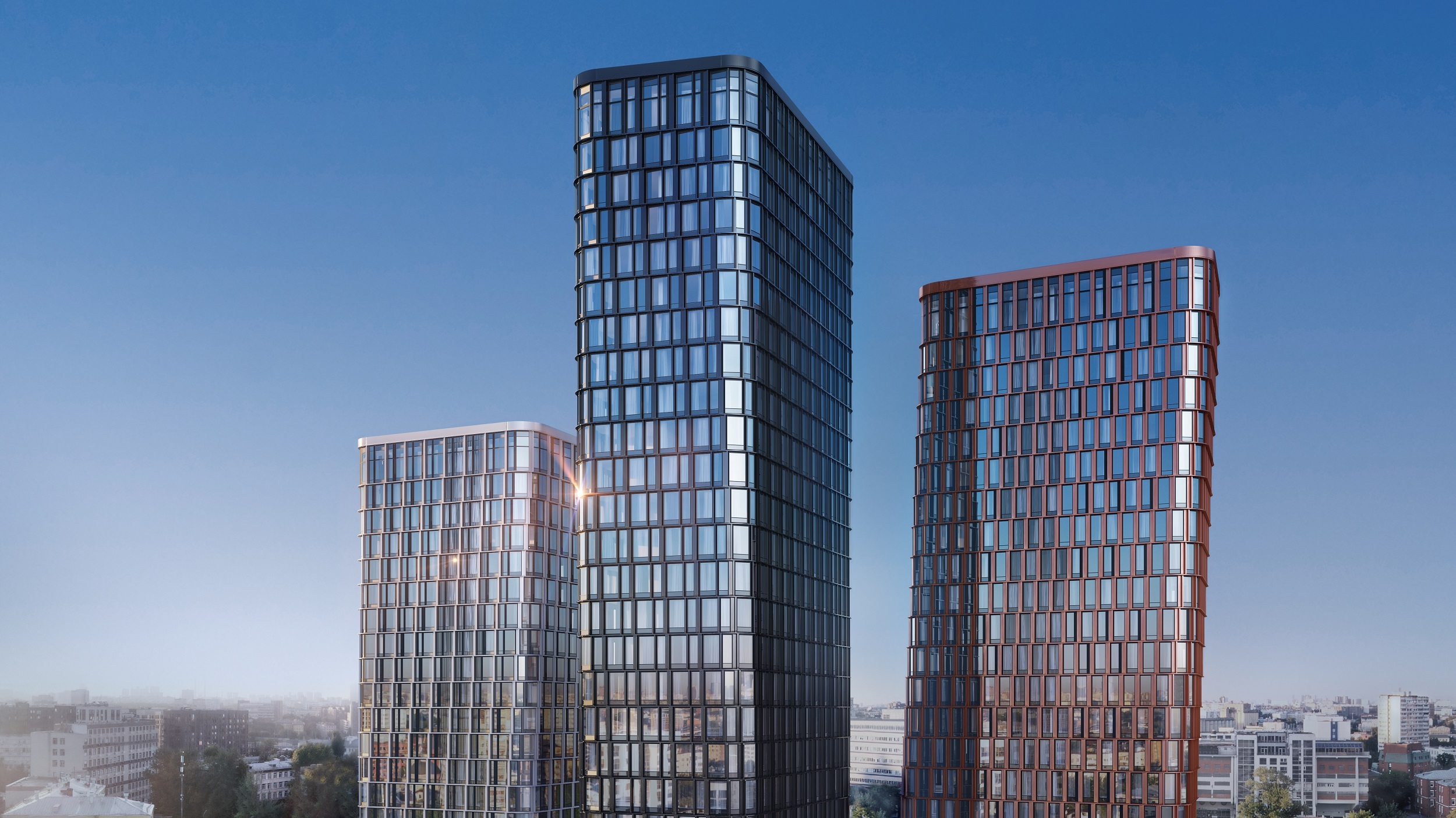 Футуристические фасады трех башен комплекса высотой 20, 23 и 27 этажей от бюро Pride имеют плавный асимметричный изгиб с «эффектом закручивания», что создает визуальное впечатление вращения зданий вокруг своей оси. Фасады состоят из алюминиевых профилей с двухкамерными энергосберегающими стеклопакетами и металлическими панелями в оттенках трех руд – никеля, меди и стали. Так архитекторы зашифровали отсылку к историческому прошлому Басманного района, чье название по одной из версий произошло от слова «басма» – это тонкие листы металла с рельефным рисунком для украшения икон.