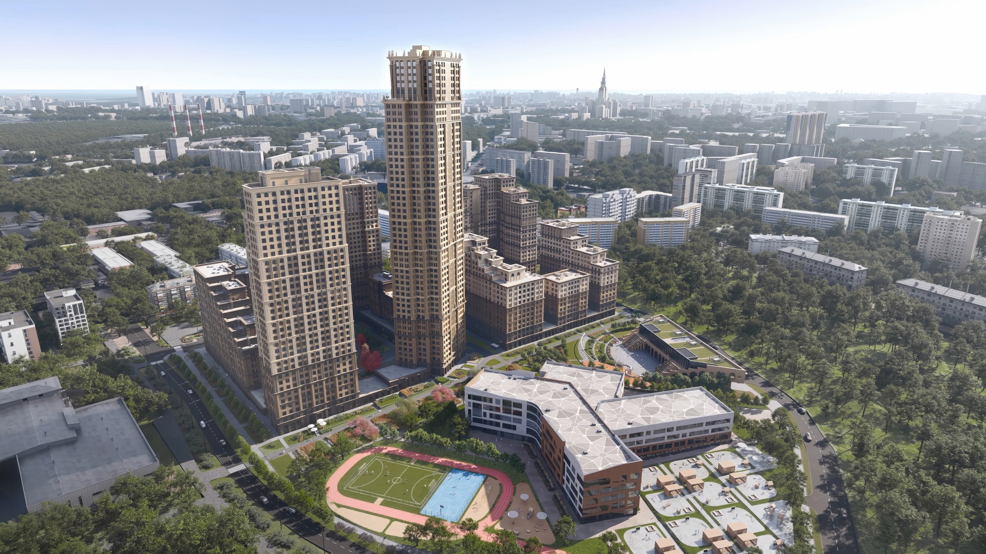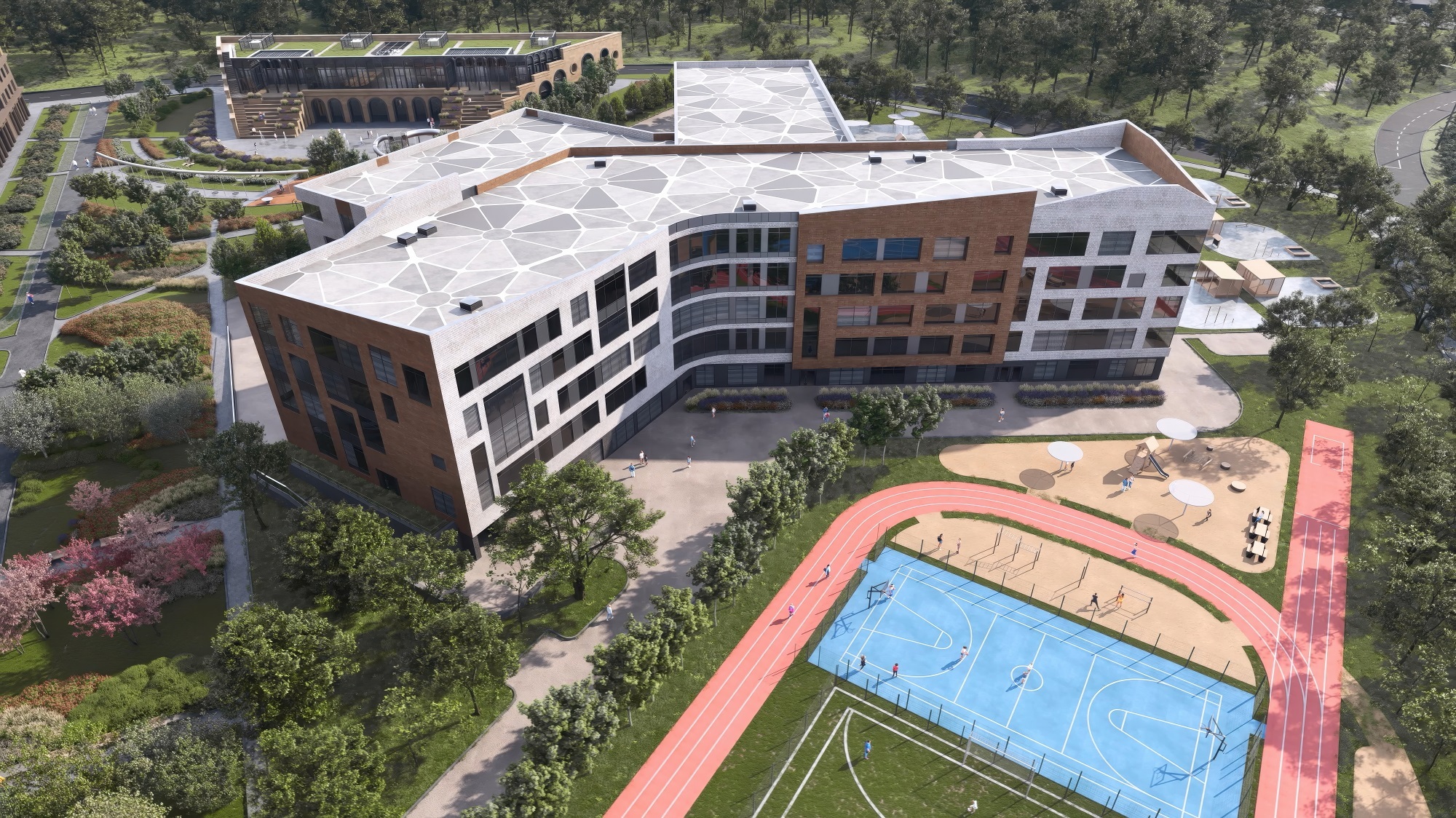 Прилегающая территория займет порядка 2 га, организованных обособленно для детского сада и школы. На территории ДОУ будет 12 площадок для прогулок с навесами и игровыми комплексами; на территории школы — спортивный стадион с универсальной площадкой для командных игр, футбольным полем, беговой дорожкой и местами для активного отдыха учеников начальных классов. Благоустройство продолжит единую концепцию озеленения, деревья и живые изгороди которой подобраны с учетом факторов сезонного цветения.