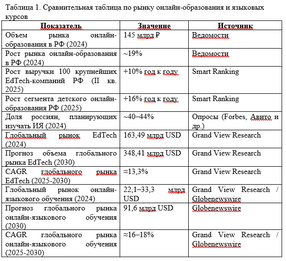 При сопоставлении российской ситуации с мировыми тенденциями очевиден разрыв в цифрах роста. Согласно данным Grand View Research, объём глобального рынка EdTech в 2024 году оценивался в 163,49 млрд долларов, а прогнозируемый среднегодовой темп роста (CAGR) на 2025–2030 годы составляет 13,3%. К 2030 году объём может достичь 348,41 млрд долларов. Другие аналитические агентства фиксируют темпы роста от 12 до 16% в разных сегментах, что значительно выше нынешних показателей российского рынка. Особенно быстро развивается сегмент языкового онлайн-образования: его объём в 2024 году оценивался от 22 до 33 млрд долларов в зависимости от источника, а прогнозируемый CAGR колеблется от 16 до 18% в ближайшие пять-семь лет. В отдельных оценках речь идёт о темпах свыше 20% до 2032 года. Таким образом, языковое обучение становится одной из наиболее привлекательных ниш глобального EdTech.