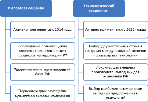 Между тем, стратегия импортозамещения долгое время основывалась на попытках воссоздать полный цикл производства российскими компаниями без привлечения внешних партнеров. С 2023 года новым взглядом на эффективность данной стратегии является внедрение термина технологический суверенитет, подразумевающего создание в том числе международных промышленных и прочих кооперационных связей для использования преимуществ всех «дружественных» России участников. Новый подход к стратегии импортозамещения строится на эффективности: технологической и экономической. Вместо попыток создавать полную цепочку собственных технологий за значительные бюджетные и частные средства, возможно найти действующие решения на рынке или создать совместные технологии, которые будут реализовываться сразу для нескольких стран, что увеличит рентабельность таких проектов и привлечет еще больше потенциальных инвесторов.