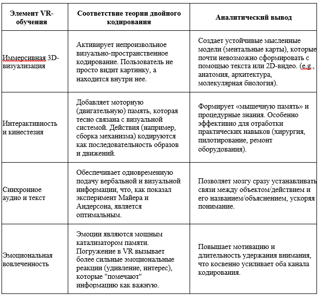 Если сопоставить возможности VR-обучения и теорию двойного кодирования, можно оценить уровень применимости данного ИТ-регения: