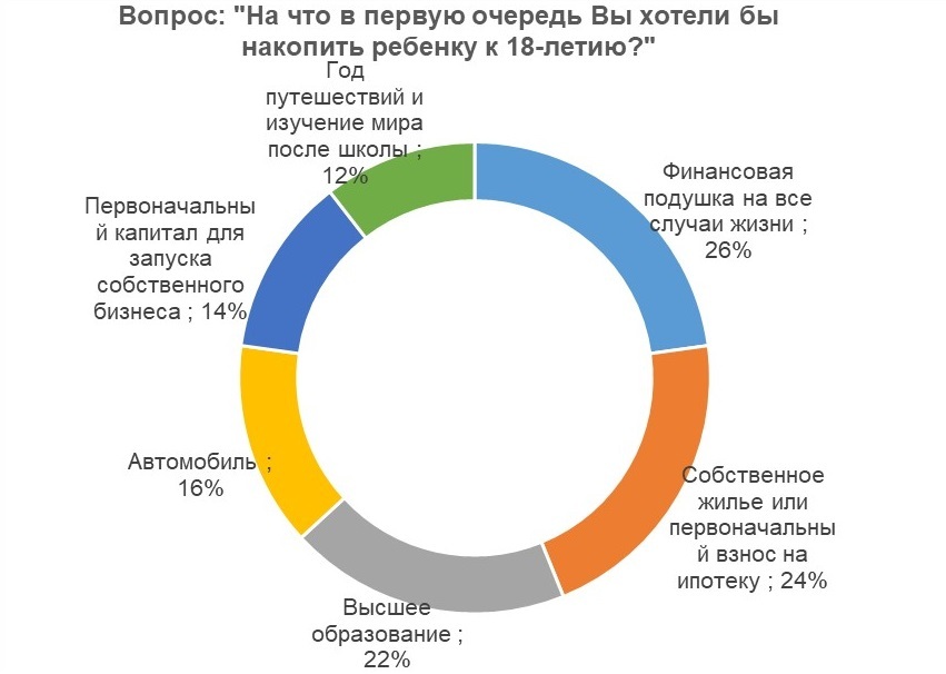 Отвечая на вопрос «На что в первую очередь Вы хотели бы накопить ребёнку к 18-летию?», респонденты также говорили о возможности купить автомобиль (так ответили 16% опрошенных) или предоставить ребёнку возможность взять творческий отпуск и путешествовать в течение года после школы (12%). Подробнее — в Графике № 1.