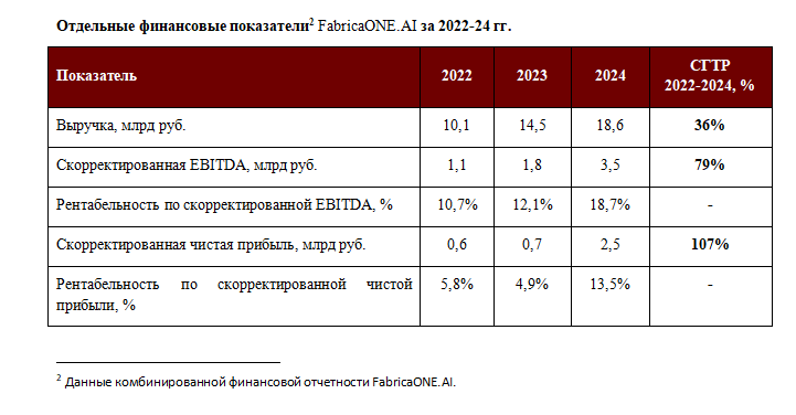 · Выручка FabricaONE.AI увеличилась с 10,1 млрд руб. в 2022 г. до 18,6 млрд руб. в 2024 г., что соответствует среднегодовому темпу роста (СГТР) на уровне 36%.