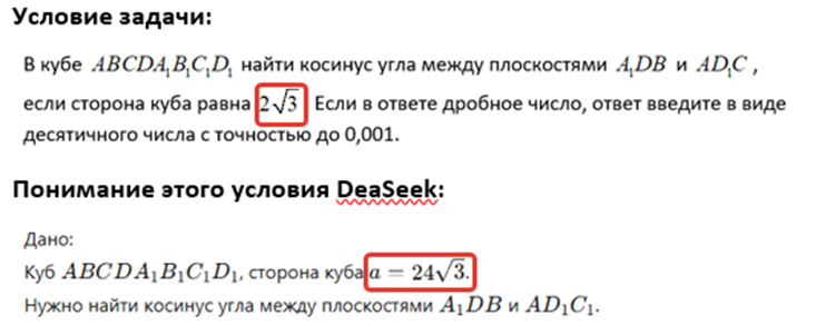 Если задания планируется решать в аудитории, то достаточно увеличить количество типовых примеров, чтобы «под давлением времени» у студентов не было возможности списать подробное решение со смартфона (мы не обсуждаем здесь проблему, как студенту не дать им воспользоваться). Интересно, что математические формулы, тексты геометрических задач с математическими символами и верхними/нижними индексами в обозначениях такой ресурс как DeepSeek распознает с ошибками (рис.3).